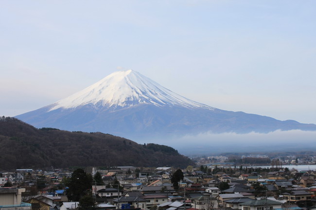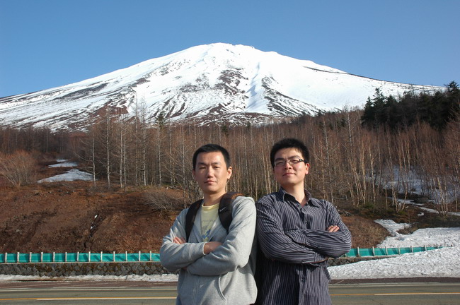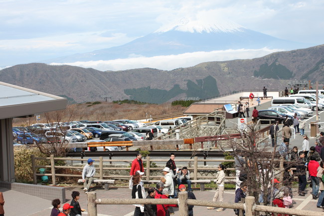 看富士山得有好的天氣。因其常常鎖在煙雨中而不得窺其貌。我們的運氣不錯,天氣晴朗。富士山白雪做冠,彩云為巾,身披綠彩,平地突兀,亭亭玉立,遠遠地迎接來(lái)自一衣帶水之隔的鄰邦來(lái)客。驅車(chē)順蜿蜒的山路,到富士山五合目。這里是盤(pán)山公路的終點(diǎn),再往上積雪滿(mǎn)坡,只有七、八、九三個(gè)月才開(kāi)放可讓旅客攀登。氣溫也驟降到冰點(diǎn),正是一山有四季。仰望山頂,也被霧所遮,身在山中,反倒不識其貌了。